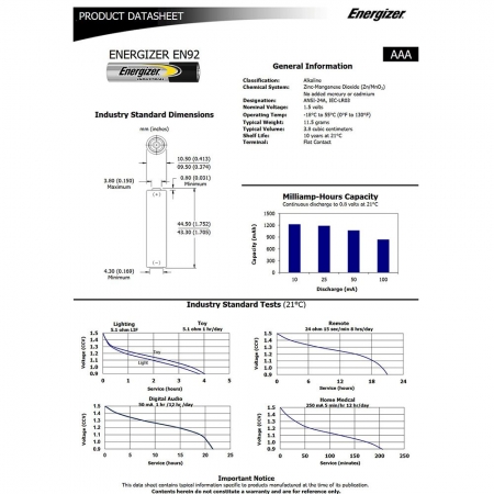 Energizer Industrial LR03 - промышленные алкалиновые батарейки размера AAA. Идеально подходят для использования в тяжелых условиях или при непрерывной работе оборудования. Отличаются высокой производительностью, могут эксплуатироваться при экстремальных температурах от -18 ° C до +55 ° C. Благодаря отличным характеристиками они подходят для применения на предприятиях, в организациях и учреждениях. Не содержат ртути и обладают длительным сроком хранения - 10 лет. Цена указана за 10 батареек. Технические характеристики