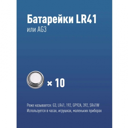 Щелочные батарейки Космос AG3 (LR736, 192, 392, 384, LR41, V3GA, 392A) применяются в часах, калькуляторах и других электронных устройствах. Цена указана за упаковку. В упаковке 10 шт.