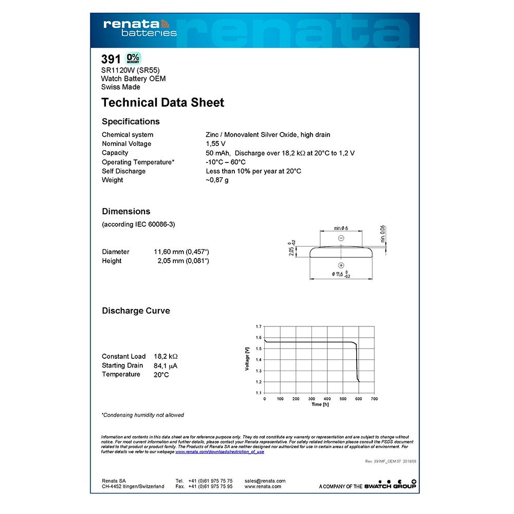 Серебряно-оксидные батарейки Renata 391 (SR1120W) используются в часах и других электронных устройствах. Отличаются высоким качеством и надежностью. Цена указана за 10 батареек.