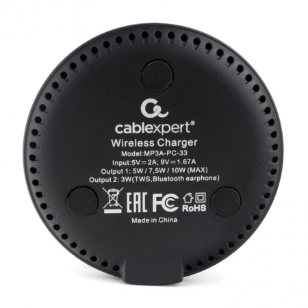 Cablexpert MP3A-PC-33 - беспроводное зарядное устройство для зарядки смартфонов, наушников и других устройств с питанием через беспроводную зарядку. Оно позволяет зарядить смартфон без использования кабеля, достаточно положить аппарат на зарядную панель. Устройство обладает максимальной мощностью 10.5 Вт. Подключается к адаптеру питания с разъемом USB A.