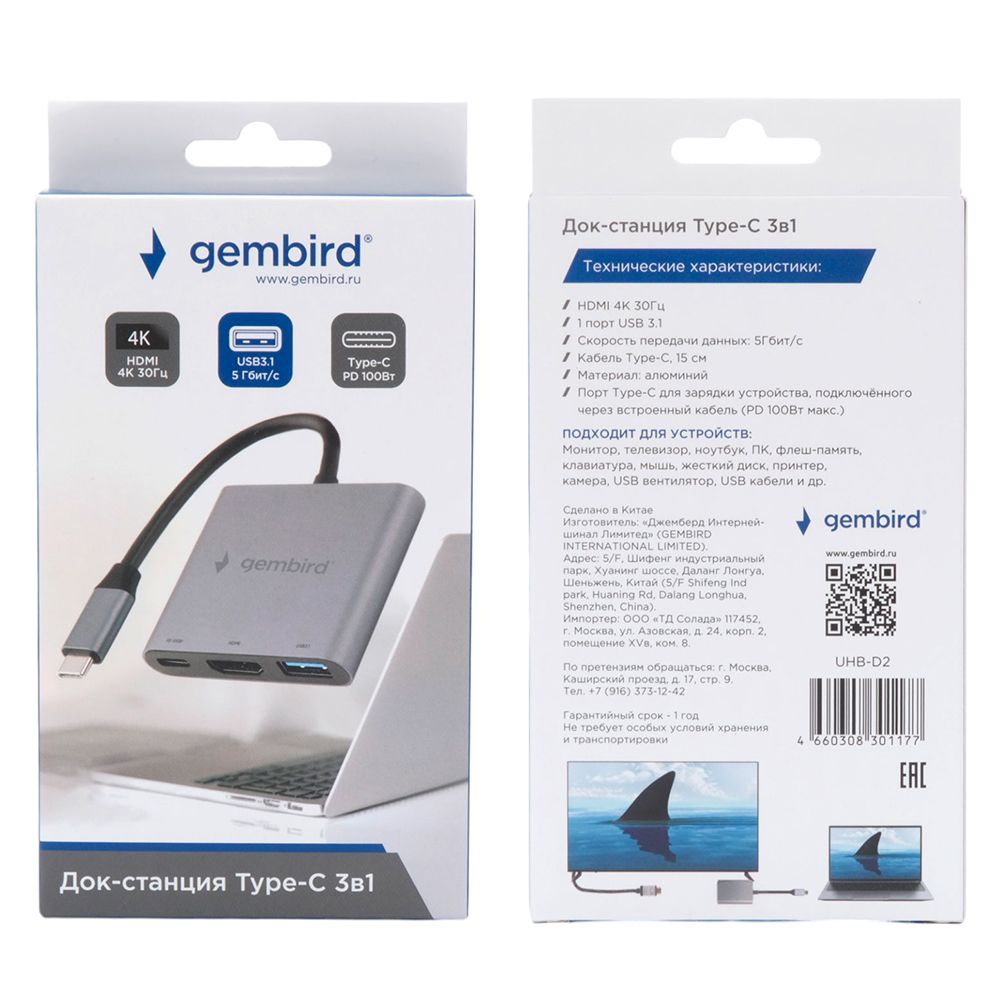 Док-станция 3 в 1 (HDMI+HUB) Gembird UHB-D2 позволяет передавать видеосигнал с устройства, оснащенного разъемом Тype C, на HDMI монитор, проектор или телевизор. Поддерживает видеоразрешение до 4K/30 Гц. Встроенный концентратор имеет порты USB 3.1 и Type C PD 100 Вт, поддерживающий быструю зарядку PD 100 Вт. Для работы адаптера не требуется установка драйверов, устройство готово к работе сразу после подключения.