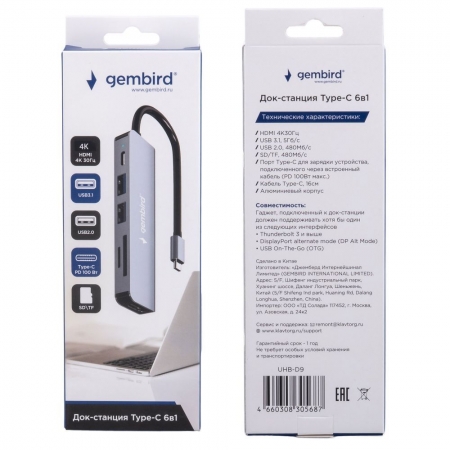Док-станция 6 в 1 Gembird UHB-D9 позволяет передавать видеосигнал с устройства, оснащенного разъемом Тype C, на HDMI монитор, проектор или телевизор. Поддерживает видеоразрешение до 4K/30 Гц. Устройство оснащено портами USB3.0, USB 2.0, Type C PD 100 Вт и картридером для карт памяти SD и MicroSD. Док-станция совместима с телефонами и планшетами, поддерживающими OTG. Технические характеристики