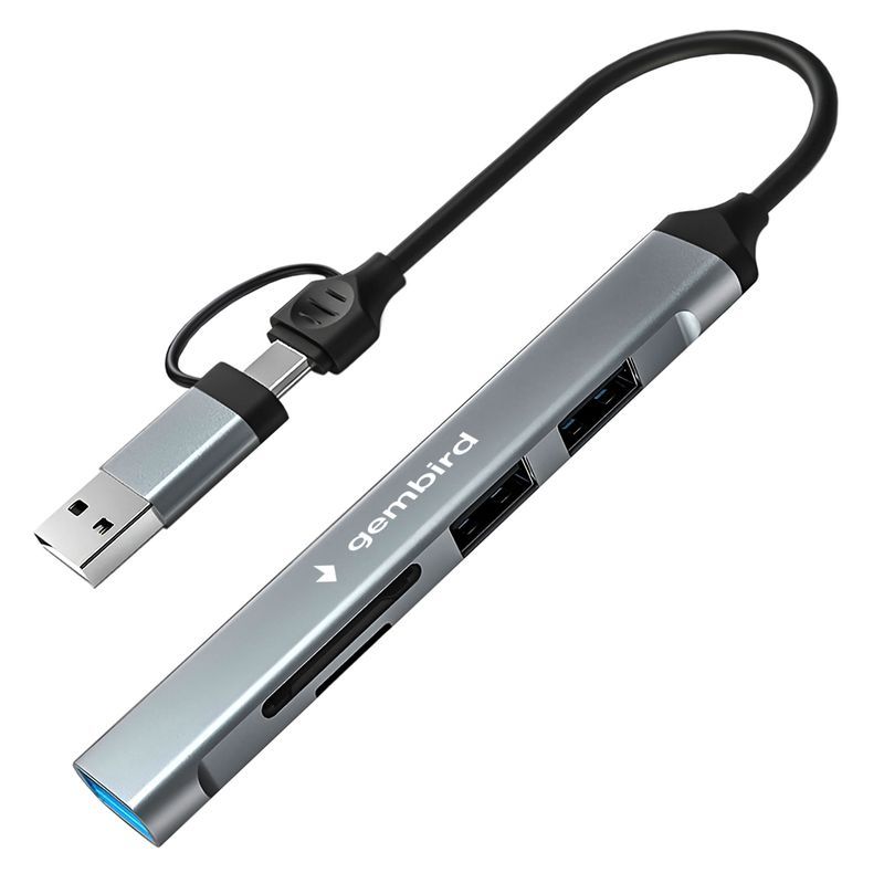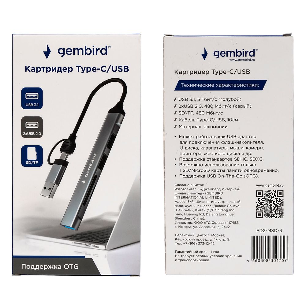 Gembird FD2-MSD-3 - универсальный картридер для карт памяти SD/microSD и USB-концентратор (хаб), который подключается через комбинированный разъем USB Type-A или Type-C. Поддерживает функции OTG (On-The-Go), позволяющая подключать периферийные устройства (например, флэш-накопители, мыши, клавиатуры) к совместимым смартфонам или планшетам.