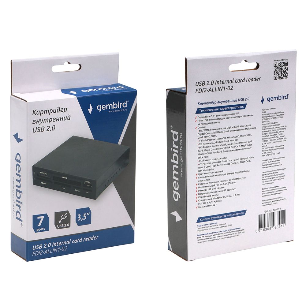 Внутренний картридер Gembird FDI2-ALLIN1-02-B предназначен для установки в 3,5 отсек системного блока. Устройство оснащено 6 слотами поддерживающими большинство типов карт памяти, индикаторами питания и передачи данных, а также портом USB 2.0. Подключается к внутреннему разъему на материнской плате.