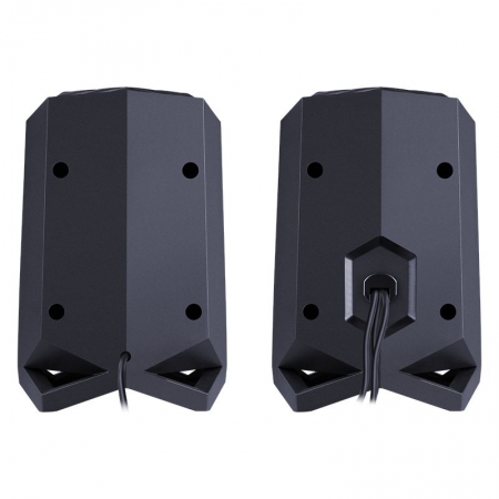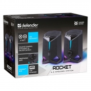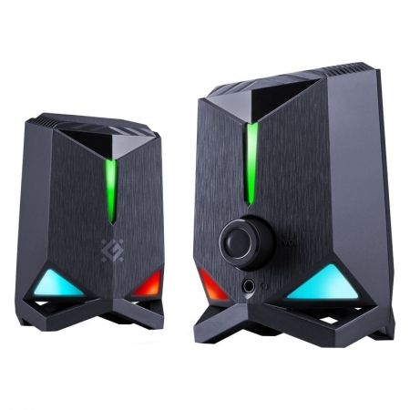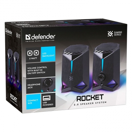 Defender Rocket - геймерские компьютерные колонки со светодиодной подсветкой. На передней панели расположен регулятор громкости со встроенным выключателем и разъем для подключения наушников. Питаются от порта USB, к источнику звука акустика подключается с помощью стандартного 3.5 мм разъема.