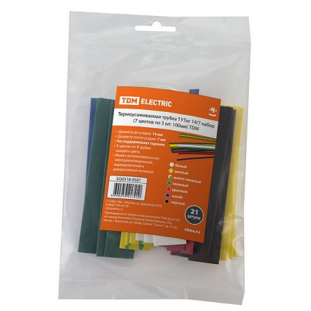 Набор термоусадочных трубок 14/7, 7 цветов по 3 шт, 10 см, TDM (SQ0518-0507)