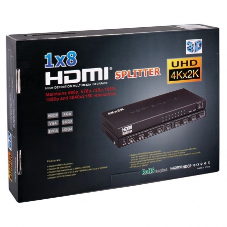 Производитель: Telecom Наименование: Разветвитель HDMI сигнала Порты: 1 вход HDMI, 8 выходов HDMI, 19 pin (A) Спецификация: HDMI v1.4, HDCP 1.4 Поддержка видео: 4K x 2K@30hz, 1080P @30hz, 1080P @60hz. Deep Color 4K @ 30Hz / 480i/ 576i/ 480p/ 576p/ 720p/1080i/ 1080p/ 1440i/ 1440p Поддержка аудиоформатов: DTS-HD/Dolby-true HD/LPCM7.1/DTS/Dolby-AC3/DSD Максимальное разрешение: 4K/30 Гц Поддержка 3D: Есть Индикация: Питание, индикатор активности для каждого порта Питание: от БП AC 100-240/ DC 5В 2 А Материал корпуса: Металл Цвет: Черный