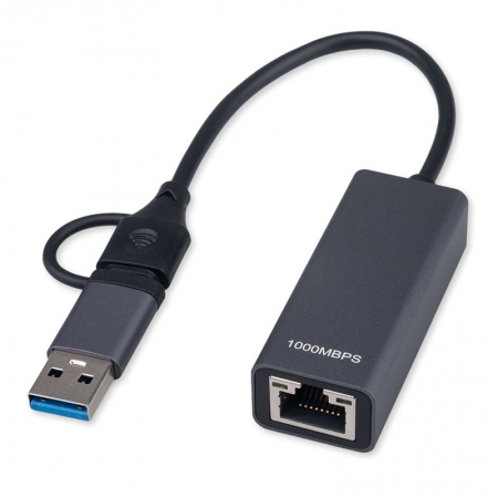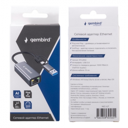 Сетевая карта USB3.0 - RJ45 1 Гбит/с, RTL8153, Type C/USB, алюминий, Gembird (NIC-U7)