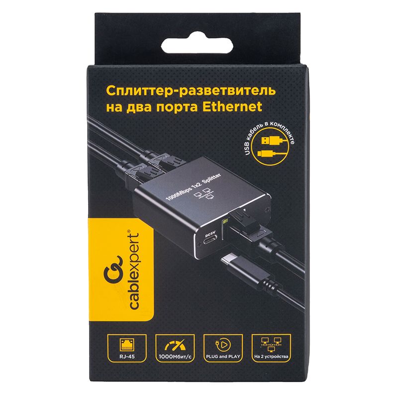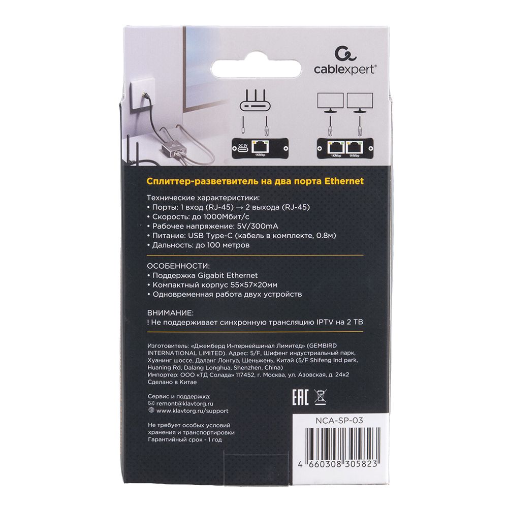 Сплиттер-разветвитель Cablexpert NCA-SP-03 на 2 порта RJ45. Поддерживает Gigabit Ethernet. Обеспечивает одновременную работу двух устройств. Питается от USB. Не поддерживает синхронную трансляцию IPTV на 2 ТВ.