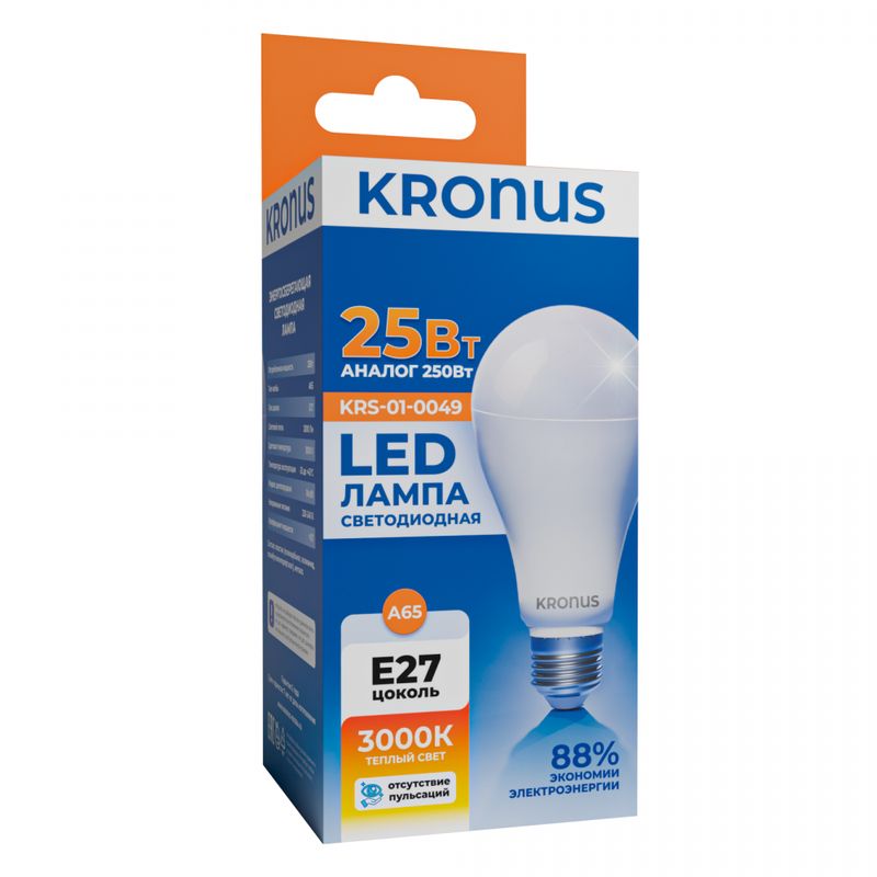 Kronus A65 - энергосберегающая лампа общего освещения, подходит для замены стандартных ламп накаливания и галогенных. Благодаря своей экономичности, длительному сроку службы и экологичности она выгодно отличаются от обычной лампы накаливания. Лампа имеет грушевидную форму и цоколь E27, что делает ее совместимым с любым светильником, в котором используются данные типы ламп. Хорошая цветопередача и отсутствие мерцания обеспечивают меньшую утомляемость глаз. Не содержит ртути и экологически безопасна.