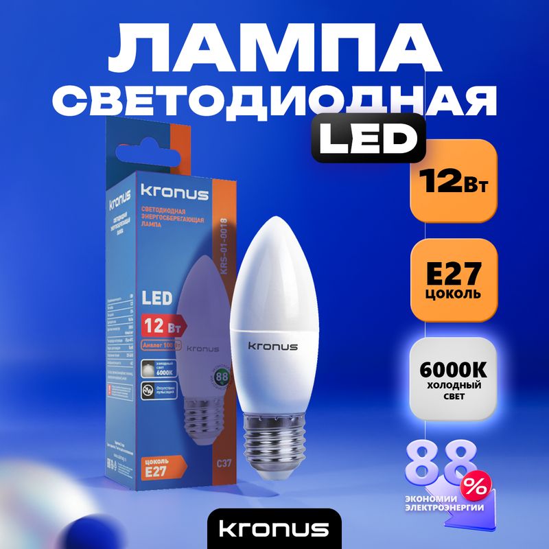 Kronus С37 - энергосберегающая светодиодная лампа общего или декоративного освещения, подходит для замены стандартных ламп накаливания и галогенных. Благодаря своей экономичности, длительному сроку службы и экологичности она выгодно отличаются от обычной лампы накаливания. Лампа С37 повторяет форму и размеры стандартных ламп типа «свеча» и идеально подходит к любому светильнику, в котором используются данные типы ламп. Колба лампы имеет матовую поверхность и оснащена цоколем E27. Хорошая цветопередача и отсутствие мерцания обеспечивают меньшую утомляемость глаз. В лампе применяется высокоэффективный драйвер с ресурсом работы до 30 000 часов. Не содержит ртути и экологически безопасна.