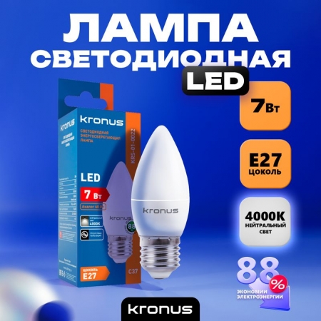 Kronus С37 - энергосберегающая светодиодная лампа общего или декоративного освещения, подходит для замены стандартных ламп накаливания и галогенных. Благодаря своей экономичности, длительному сроку службы и экологичности она выгодно отличаются от обычной лампы накаливания. Лампа С37 повторяет форму и размеры стандартных ламп типа «свеча» и идеально подходит к любому светильнику, в котором используются данные типы ламп. Колба лампы имеет матовую поверхность и оснащена цоколем E27. Хорошая цветопередача и отсутствие мерцания обеспечивают меньшую утомляемость глаз. В лампе применяется высокоэффективный драйвер с ресурсом работы до 30 000 часов. Не содержит ртути и экологически безопасна.