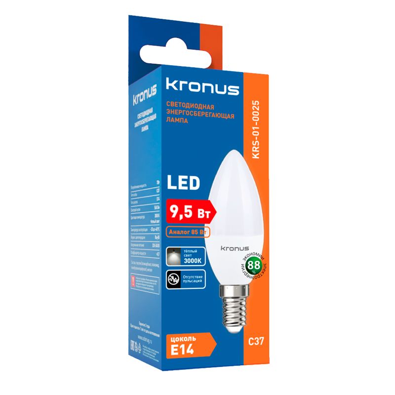 Kronus С37 - энергосберегающая светодиодная лампа общего или декоративного освещения, подходит для замены стандартных ламп накаливания и галогенных. Благодаря своей экономичности, длительному сроку службы и экологичности она выгодно отличаются от обычной лампы накаливания. Лампа С37 повторяет форму и размеры стандартных ламп типа «свеча» и идеально подходит к любому светильнику, в котором используются данные типы ламп. Колба лампы имеет матовую поверхность и оснащена цоколем E14. Хорошая цветопередача и отсутствие мерцания обеспечивают меньшую утомляемость глаз. В лампе применяется высокоэффективный драйвер с ресурсом работы до 30 000 часов. Не содержит ртути и экологически безопасна.