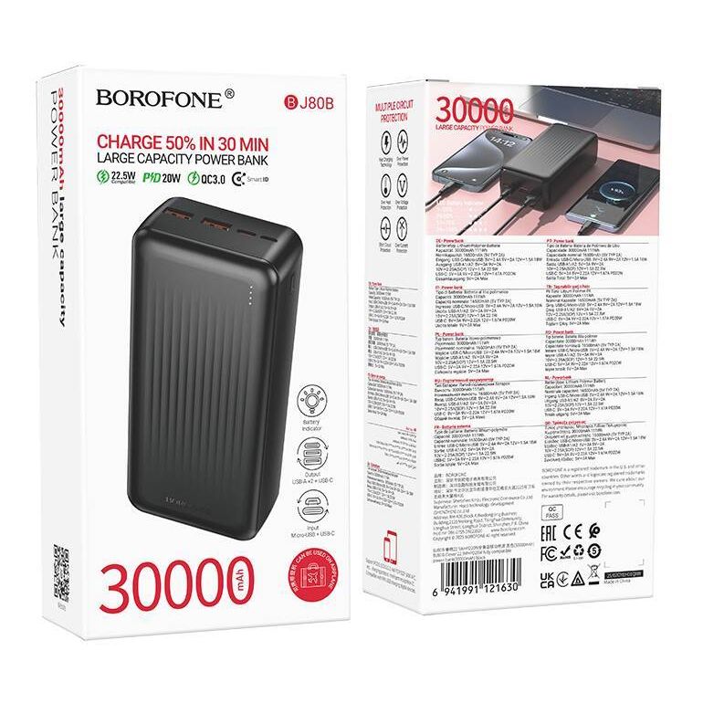 Внешний аккумулятор Borofone BJ80B Clever с поддержкой стандартов быстрой зарядки PD 20W, QС3.0/2.0, FCP, AFC, SCP. Устройство оснащено литий-полимерной батареей емкостью 30000 мАч, двумя выходными портами USB-A и портом USB-C. Для зарядки повербанка используется вход Type C или Micro USB, поддерживающие быструю зарядку. Контроль за уровнем заряда аккумулятора осуществляется с помощью светодиодного индикатора.