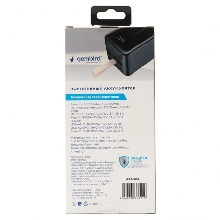 Внешний аккумулятор Gembird GPB-50Q обеспечит мобильную технику необходимым резервным питанием во время поездок и путешествий. Устройство оснащено литий-полимерной батареей емкостью 50000 мАч и поддерживает стандарты быстрой зарядки QC/PD/FCP/SCP/AFC. Благодаря двум USB-выходам и выходу USB-C вы сможете заряжать 3 устройства одновременно. Для зарядки повербанка имеются два входа Micro USB и USB C. Функция сквозной зарядки (pass-through charging) позволяет одновременно заряжать повербанк и подключенное устройство. Контроль за уровнем заряда аккумулятора осуществляется с помощью цифрового дисплея. Корпус выполнен из ударопрочного пластика и имеет удобный подвес.