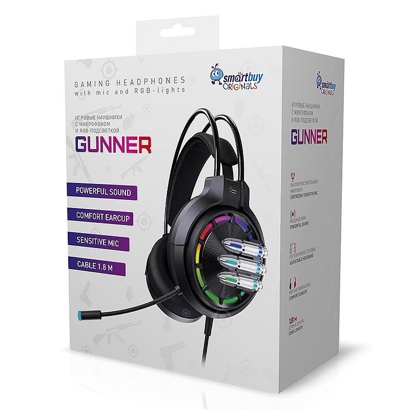 Smartbuy GUNNER игровые наушники с микрофоном и мощным звуком! Стильная RGB-подсветка молдинга в виде пулеметной ленты глубже погружает в атмосферу игры. Игровые 40 мм стерео динамики обеспечат точную передачу звуковых эффектов, голоса и музыки. Высокочувствительный микрофон сбережет ваши голосовые связки даже во время очень напряженных сражений. Регулятор громкости улучшает эргономику гарнитуры, не нужно изменять настройки игры и ОС. Металлические направляющие в силиконовой оплетке гарантируют плотное прижатие наушников. Эластичное адаптируемое оголовье из мягкой искусственной кожи обеспечит плотное прилегание гарнитуры к голове. Длинный кабель 1,8 м в нейлоновой оплетке не загибается и не путается. Амбушюры из искусственной кожи гарантируют отсутствие усталости даже после нескольких часов непрерывных баталий. Аппаратные требования: наличие звукового выхода и входа Mini Jack 3,5 мм для наушников и микрофона на компьютере или ноутбуке, питающий USB порт для подсветки.