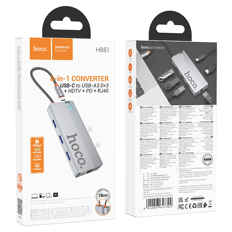 Док-станция 6 в 1 (HDMI+HUB+RJ45) HOCO HB51 Wow позволяет передавать видеосигнал с устройства, оснащенного разъемом Тype C, на HDMI монитор, проектор или телевизор. Поддерживает видеоразрешение до 4K/60 Гц. Встроенный концентратор имеет 3 порта USB3.0 и порт Type C, поддерживающий быструю зарядку PD 100W. Также имеется