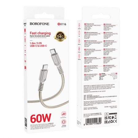 Производитель: Borofone Наименование: USB-кабель Предназначение: Синхронизация, передача данных, подзарядка Интерфейс: USB 2.0 Пропускная способность интерфейса: до 480 Мбит/сек Максимальный ток: 3 А Максимальная мощность: 60 Вт Поддержка быстрой зарядки: PD / QC3.0 Разъемы: Type C (m) - Type C (m) Оболочка кабеля: Нейлон Длина кабеля: 1 м Цвет: Серый