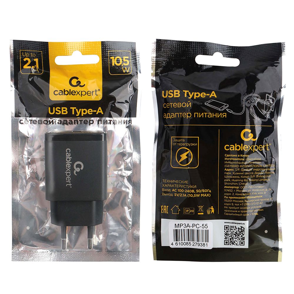 Главная / Электропитание / Блоки питания и зарядные устройства / Сетевые зарядные устройства / Зарядное устройство Cablexpert MP3A-PC-55 100/220V->5V, 2.1A USB, черное